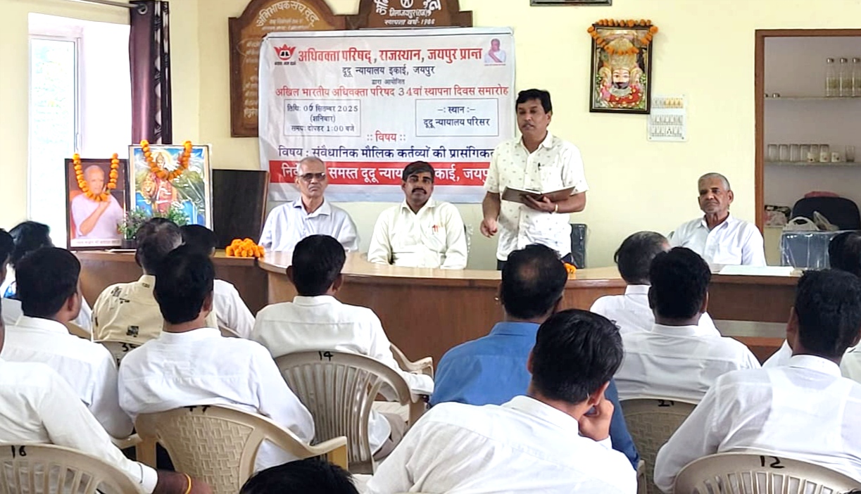 दूदू (जयपुर) अधिवक्ता परिषद राजस्थान, जयपुर प्रांत की दूदू न्यायालय इकाई द्वारा अखिल भारतीय अधिवक्ता परिषद के 34वें स्थापना दिवस के अवसर पर शनिवार को ‘संवैधानिक मूल्यों की प्रासंगिकता’ विषयक संगोष्ठी का आयोजन किया गया। मुख्य वक्ता परिषद के क्षेत्रीय मंत्री कमल परसावल ने संविधान द्वारा उपलब्ध विभिन्न याचिकाओं एवं रिट के प्रावधानों की जानकारी दी और बताया कि अंतिम व्यक्ति तक न्याय की पहुंच सुनिश्चित करना संविधान का मुख्य उद्देश्य है। कार्यक्रम अध्यक्ष वरिष्ठ अधिवक्ता कृष्ण कुमार लखेरा ने समाज में नैतिकता और राष्ट्रीयता के संकल्प पर बल देते हुए, कथनी व करनी में एकरूपता रखने की आवश्यकता बताई।
