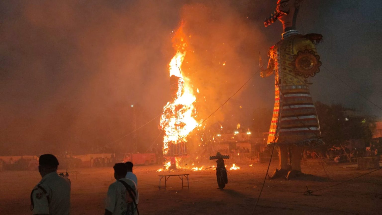 बुराई पर हुई अच्छाई की जीत 5 मिनट में रावण का हुआ दहन, रामलीला मैदान में उमडी हजारों की भीड़ पाली 2 अक्टूबर बुराई पर अच्छाई की जीत का पर्व विजयदशमी शहर समेत जिले भर में धूमधाम से मनाया गया, पाली नगर निगम की रामलीला मैदान में आयोजित मेले को देखने हजारों शहर बस की उम्ड पड़े , जिसे लेकर मस्तान बावजी का रास्ता ड्राइवड किया गया, चप्पे चप्पे पर पुलिस की तैनातगी मौजूद थी, इधर रघुनाथ जी मंदिर से भगवान राम की शोभायात्रा शाम 5:00 बजे बैंड बाजा के साथ रवाना हुई जो विभिन्न मार्ग से होते हुए रामलीला मैदान पहुंची, जिसमें राम लक्ष्मण रावण मेघनाथ अंगद हनुमान विभीषण बने हुए रामलीला के कलाकार वह लोग झंडा लेकर रावण के चारों ओर घूमते हैं इसके बाद कलाकार राम रावण युद्ध करते हैं, ठीक रिमोट से 7:00 बजे अतिथियों द्वारा लंका दहन किया गया, हनुमान जी की पूंछ से लंका जलने लगी और उसमें पटाखे फोड़ते रहे, उसके बाद मेघनाथ कुंभकरण का पुतला जलाया गया, अंत मे रिमोट द्वारा रावण का पुतले का दहन हुआ, रावण के मुंह से चिंगारी, सर पर लगी छतरी से चिंगारियां, नाभि में चक्र चला, उसके बाद आतिशबाजी के बीच रावण का दहन किया गया, नगर निगम की ओर से रावण दहन के बाद आधा घंटे तक आसमान में रंग बिरंगी आतिशबाजी होती रही, इधर स्टेज पर नगर निगम की ओर से सभी अतिथियों का माल्यार्पण कर साफा पहनाया गया मेला देखने करीब 10 हजार की भीड मौजूद रही
