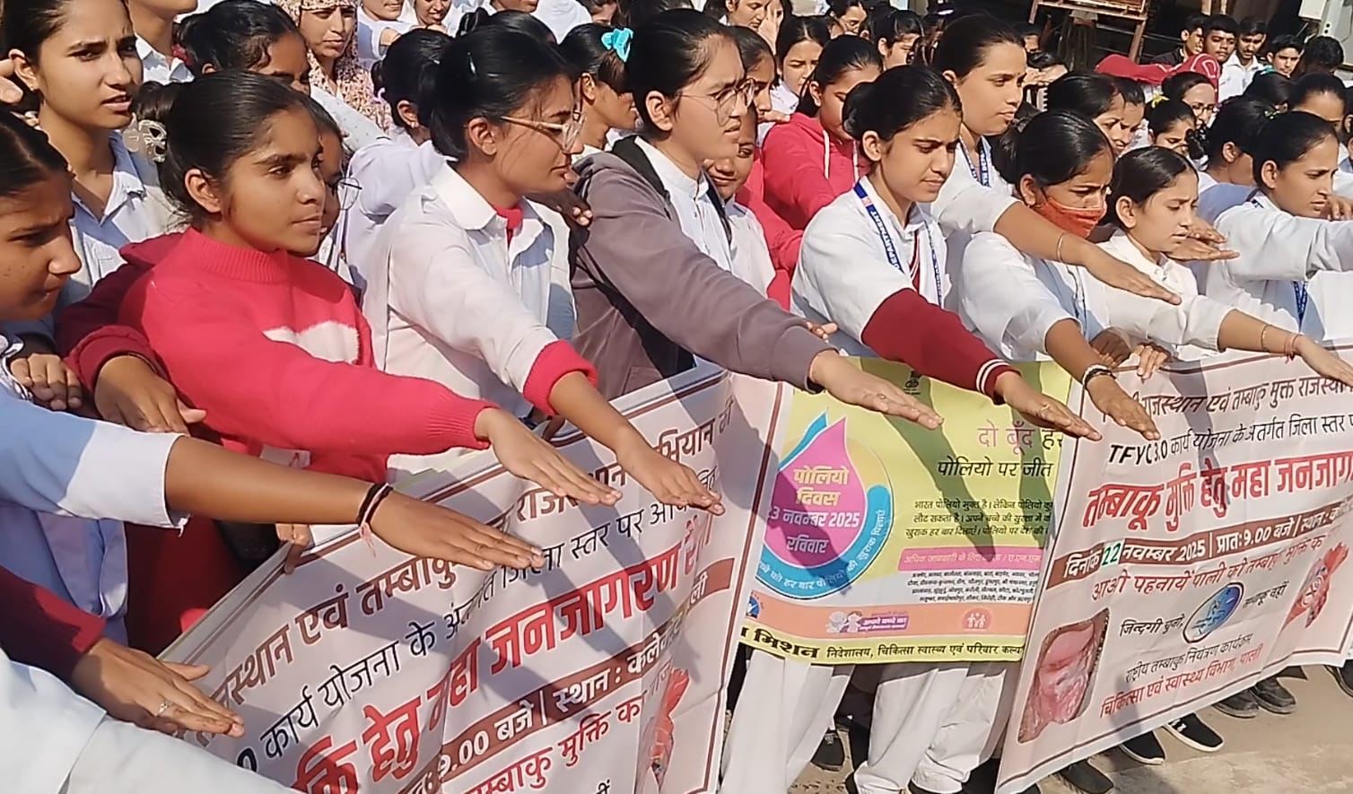 पाली सीएमएचओ डॉ. विकास मारवाल ने बताया कि जागरूकता रैली शहर के सूरजपोल सहित विभिन्न क्षेत्रों में से निकाली गई। रैली में एएनएम ट्रेनिंग सेंटर के प्रशिक्षणार्थी एवं जीएनएम प्रशिक्षण केंद्र के प्रशिक्षणार्थी दो बूंद जिंदगी की, पोलियो रविवार 23 नवंबर, पाँच वर्ष तक के बच्चों को पोलियो रोधी खुराक अवश्य पिलाएं, पोलियो की खुराक पीने से एक भी बच्चा वंचित नहीं रहे, एक भी बच्चा दवा पीने से छूटा तो समझो सुरक्षा चक्र टूटा, जैसे संदेश दे रहे थे। इस अवसर पर बांगड़ चिकित्सालय के शिशु रोग विशेषज्ञ डॉ.एसएन स्वर्णकार, एएनएमटीसी प्रधानाचार्य केसी सैनी,