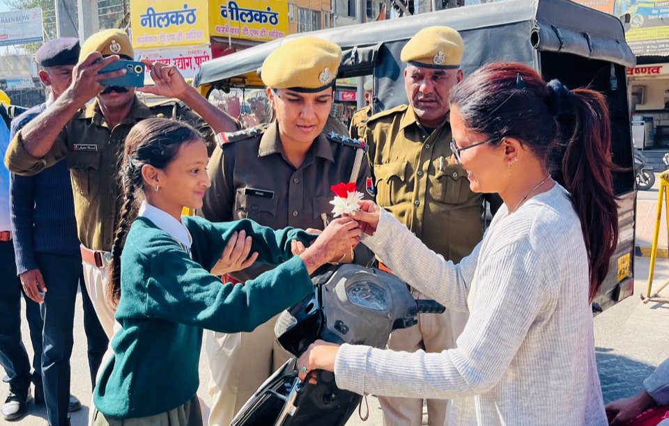 यातायात नियमों को तोड़ने वाले वाहन चालकों को फूल देकर किया “लज्जित”