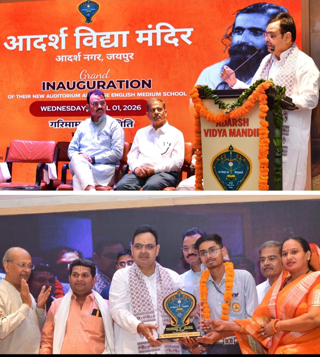 लोकार्पण समारोह को संबोधित किया। इससे पहले उन्होंने पुनर्निर्मित सभागार का फीता खोलकर लोकार्पण किया तथा पट्टिका का अनावरण किया। इस दौरान ने विद्यालय के उत्कृष्ट विद्यार्थियों तथा भवन निर्माण में सहयोग देने वाले भामाशाहों का मंत्री भजन लाल शर्मा ने सम्मान भी किया। आदर्श विद्या मंदिर के होनहार विद्यार्थियों का भी सम्मान किया।अवसर पर उपमुख्यमंत्री डॉ. प्रेमचन्द बैरवा, विधायक गोपाल शर्मा, बालमुकुंदाचार्य सहित संस्थान के पदाधिकारी, अध्यापक तथा बड़ी संख्या में छात्र-छात्राएं उपस्थित रहे।